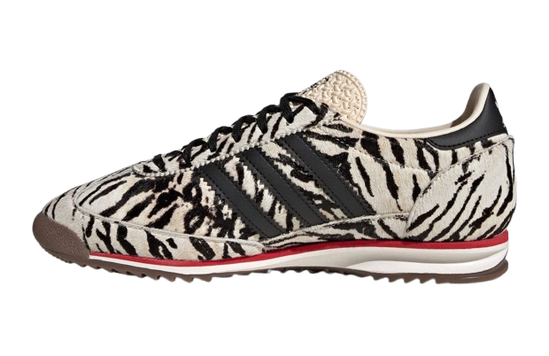 The SL 72 “Zebra” is built on a base of cream and black hair-textured fabric, overlaid with faux zebra striping that adds visual depth and motion. Smooth black leather overlays frame the Three Stripes, heel tab, and eyestays, creating contrast and structure. The vintage aesthetic persists in details: a red-trimmed white midsole and gum outsole nod to running heritage, while gold-foil branding on the heel and a textured tongue badge contribute that premium finishing touch.