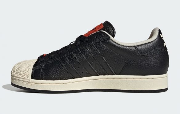 The upper, crafted from black pebbled leather, exudes character and authenticity, while a red tongue label bearing “Paris” and the Trefoil mark adds a bold contrast. Inside, shearling lining delivers comfort and warmth, and the red tartan insole nods to the rebellious ’80s and ’90s rap scenes that shaped Paris’ musical identity.