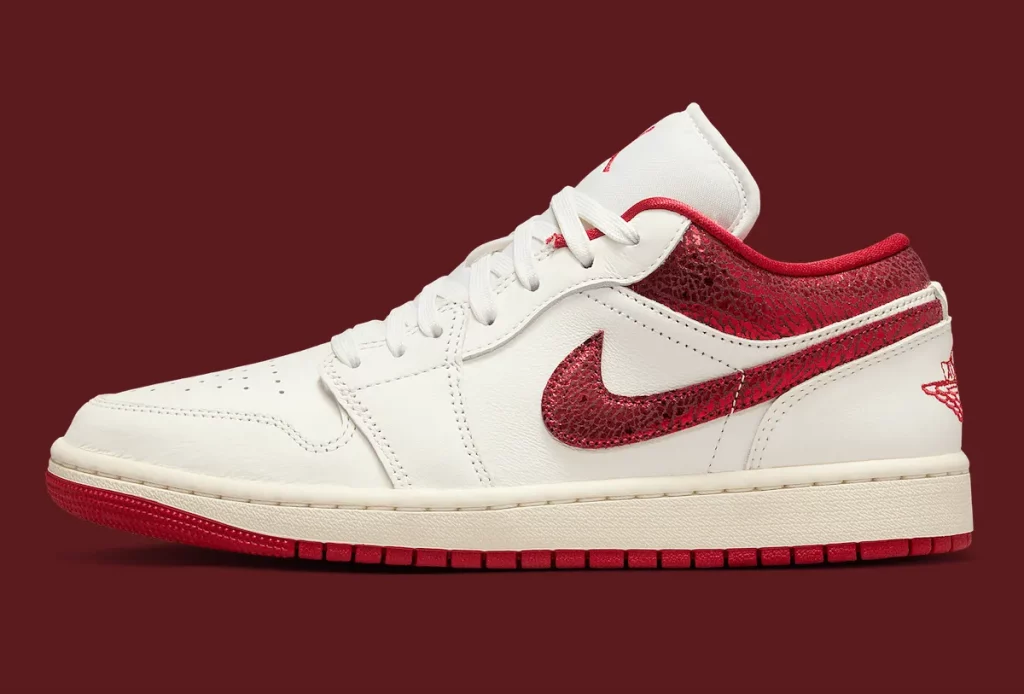To mark Jordan Brand’s 40th Anniversary, the Air Jordan 1 Low “Ruby” brings gem-like elegance to a beloved classic. Launching as a women’s exclusive, this summer-ready sneaker captures the essence of the iconic ruby stone with bold red tones and luxe textures. Dressed in Sail, Team Red, and Varsity Red, the shoe’s upper features a smooth leather base contrasted by cracked leather overlays, a nod to both premium craftsmanship and vintage appeal. Rich red hues shine on the Swoosh, heel, and embroidered Wings logo, offering a layered look that’s both modern and rooted in heritage.