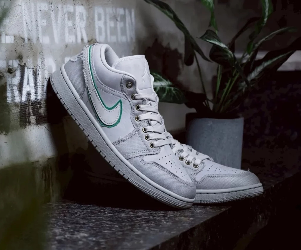 The Air Jordan 1 Low SE “Distressed” swaps polish for personality, arriving with a rugged, lived-in look that’s all about attitude. Crafted with a mix of grey canvas and suede, the upper features frayed overlays that channel that perfectly broken-in vibe, like your favourite jeans, but laced up and ready for the streets. The Swoosh gets the spotlight treatment with a double-layered, distressed design outlined in subtle green, adding depth and character. A stitched-on Wings logo at the heel continues the deconstructed aesthetic, while brass eyelets bring in a touch of vintage flair. White laces add contrast, keeping the overall look fresh and versatile.