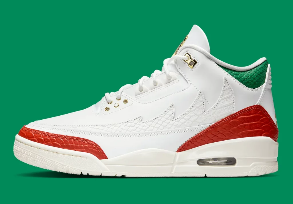 Jordan Brand extends its cultural storytelling in 2025 with the Air Jordan 3 Mexico “El Vuelo”, a striking follow-up to last year’s Air Jordan 5 “El Grito.” This edition pays homage to Mexico City’s lucha libre wrestling tradition, drawing a parallel between Michael Jordan’s gravity-defying flight and the masked wrestlers’ aerial artistry. The sneaker comes dressed in a Summit White leather upper, elevated by green, white, and red details nodding to the Mexican flag. Overlays cut from textured and patent leather recall the bold, theatrical designs of traditional luchador masks, bringing heritage into the spotlight. Metallic Gold eyelets and Jumpman branding shine like championship gold, while Pine Green and Dragon Red accents add a festive energy throughout.