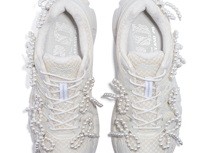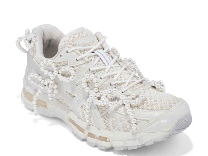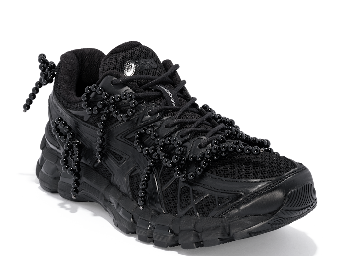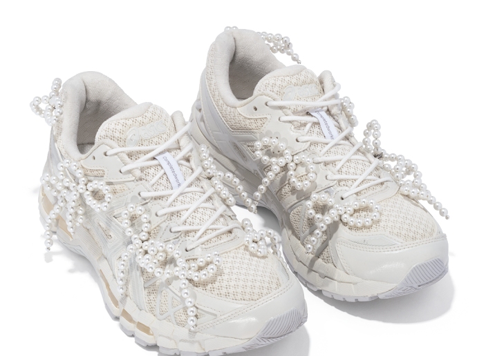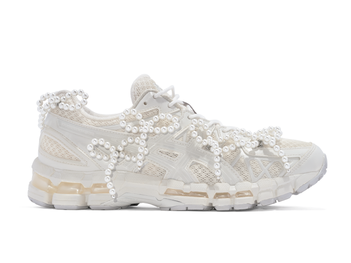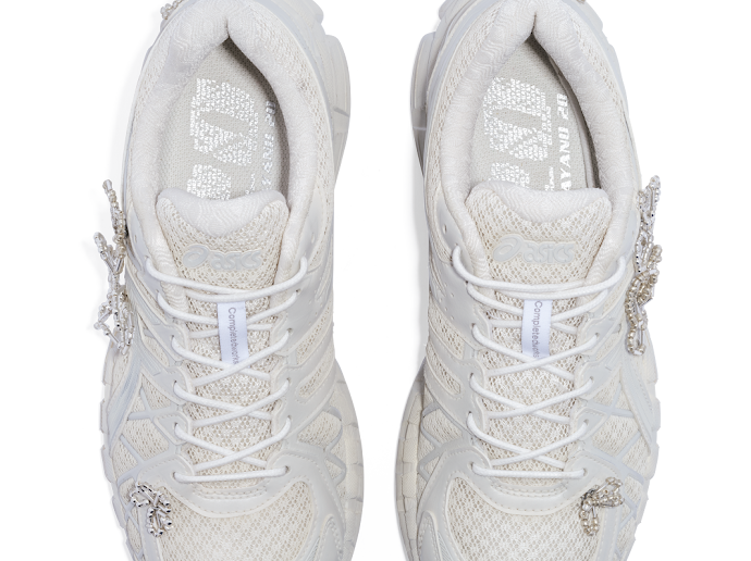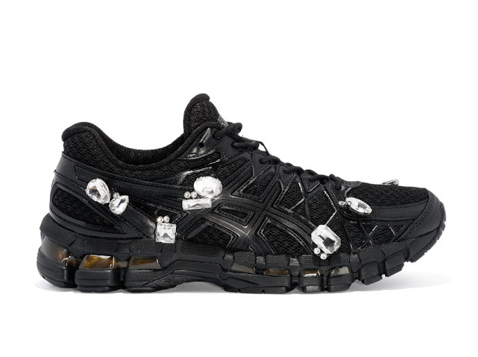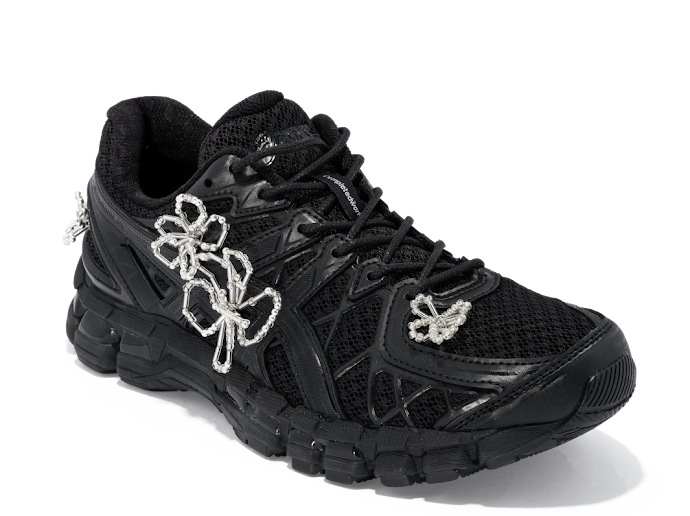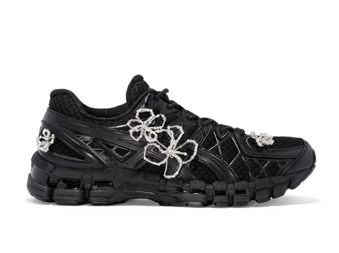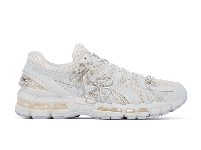 The base silhouette is still recognisable. The GEL-KAYANO 20 has all the hallmarks of its archive performance roots, layered mesh, structured overlays, visible GEL cushioning and an early-2010 runner shape. Completedworks shifts that tone fully. Hand-applied details, mismatched gem placements, pearlescent bow motifs and delicate floral touches interrupt the technical framework. Available in vlack and white, each pair plays with contrast.