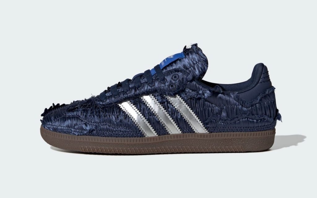 Refined yet edgy, the Dark Blue edition of the Caroline Hu x adidas Samba offers a deep, moody aesthetic. The shimmering satin upper is paired with metallic silver Three Stripes and branding, creating a striking contrast. Delicate raw edges and smocked detailing reinforce the designer’s couture influence, while a chalk white midsole softens the look. Finished with a timeless gum outsole, this iteration merges heritage with modern fashion sensibility.