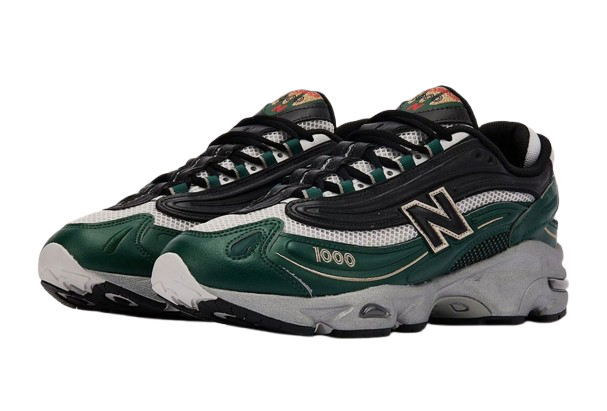 Gold “1000” embroidery on the heel provides a premium highlight, while cream contrast stitching adds a handcrafted dimension to the design. A gradient effect on the heel panel shifts from deep green to black, grounding the composition with subtle depth.