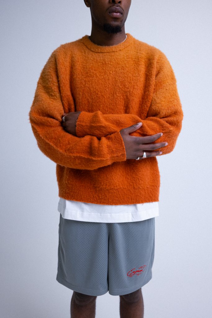 Where Drop 1 set the tone, Drop 2 turns up the volume. The collection features punchy graphic tees in acid green, lilac, and lemon, loud and unapologetic. Mesh basketball shorts return with contrast calligraphy logo embroidery, now in deeper, more saturated shades like cobalt and asphalt. But the standout? The long-anticipated heavyweight knit, teased for months, finally lands in a smooth orange gradient, a centrepiece that feels both wearable and expressive.