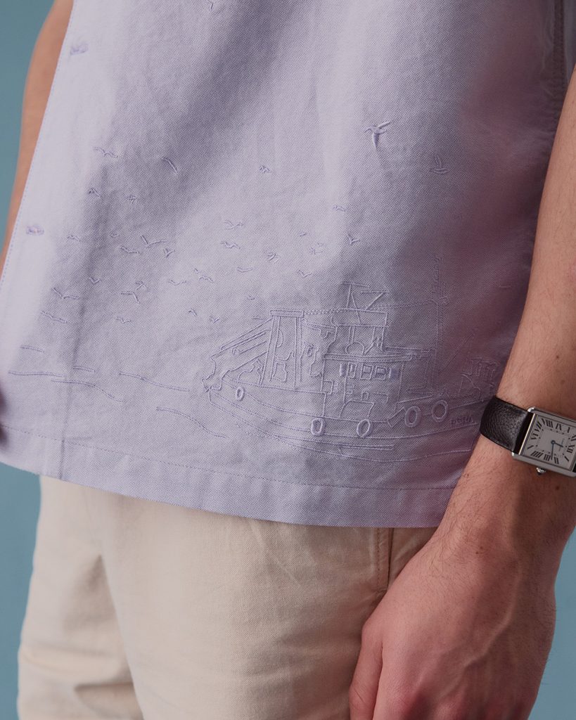 The short-sleeve Embroidered Dune Shirt focuses on the details. At first glance, it looks clean and simple, but upon closer inspection it reveals a tonal fishinb boag stitched along the hem.