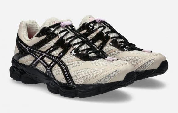 The palette speaks first: pale sand mesh layered with glossy black overlays and those unmistakable ASICS Tiger Stripes. There’s a grounded stability to it, solid, enduring, but the details tell another story. Delicate pink accents on the aglets, lace toggles and tongue logos breathe warmth into the cool tones, suggesting something human and emotional beneath the technical finish.