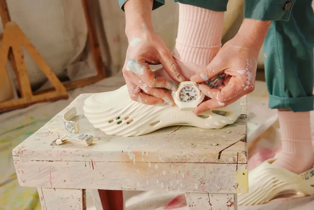 Meet the G-SHOCK x Crocs Echo Wave, a futuristic fusion of footwear and function. This bold collaboration transforms the classic Crocs Echo Wave into a statement-making slip-on, featuring an off-white glow-in-the-dark upper that shines like neon under blackout conditions. But the real head-turner? A fully functional G-SHOCK watch mounted directly onto the heel strap. Crafted for comfort with Crocs’ signature wavy foam design, the Echo Wave silhouette gets a sci-fi twist with removable timekeeping yes, you can wear the watch on your wrist too. The strap and watch flaunt a wild marbled blend of green, pink, and off-white, evoking the chaos and creativity of an abstract art studio. From late-night gallery hops to daylight flexes, this wearable art piece is perfect for creatives, rebels, and anyone who wants to show up on time and in style.