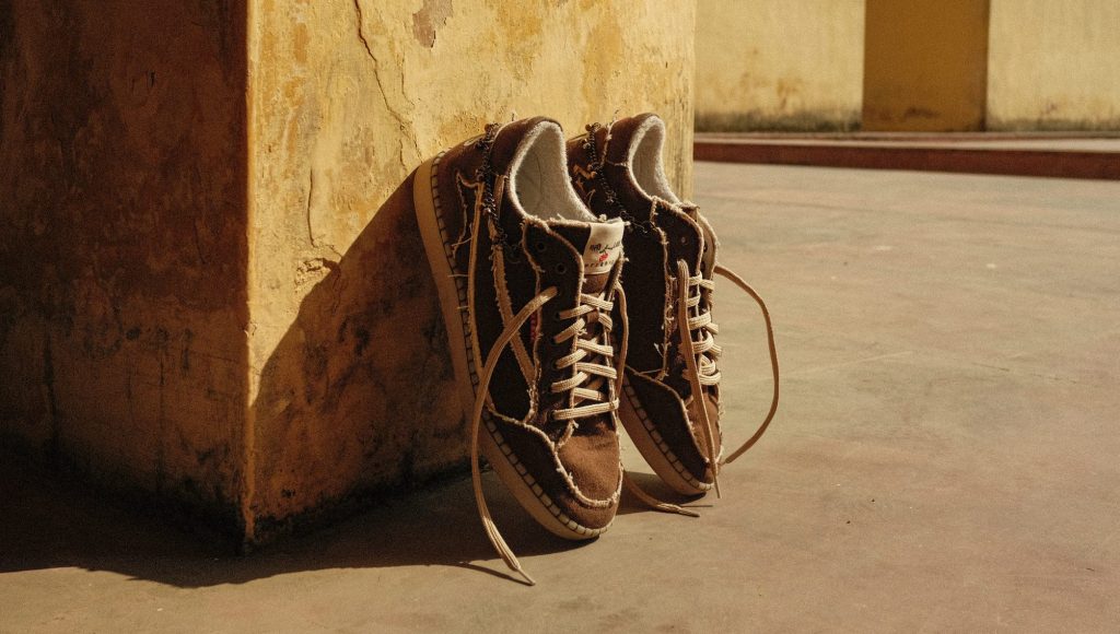 What sets this sneaker apart is its intricate and thoughtful design. Upon closer inspection, you’ll notice a stunning array of unique details, such as the hand-stitched blanket stitches on the sole. This couture-inspired feature requires over an hour of meticulous craftsmanship for each shoe, a rare display of care and precision in the world of streetwear. Inside, the vibrant green ghunghru print on the sockliner brings a playful and unexpected burst of colour. Each step becomes a tribute to rhythm and movement, echoing the lively spirit of Indian dance.