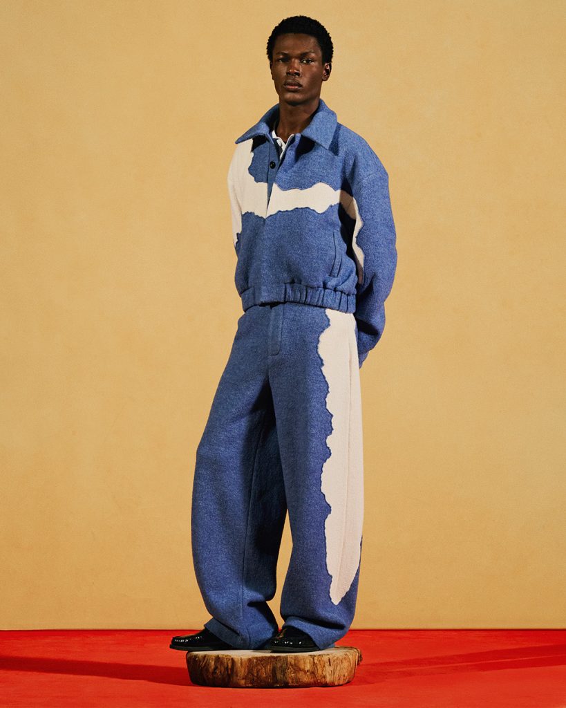 TESHIGA also introduces structured silhouettes that ground the collection. A jacket designed around the concept of scaling scooes ties the narrative into a more technical aesthetic, which is supporter by matching trousers to create a sense oc uniformity.