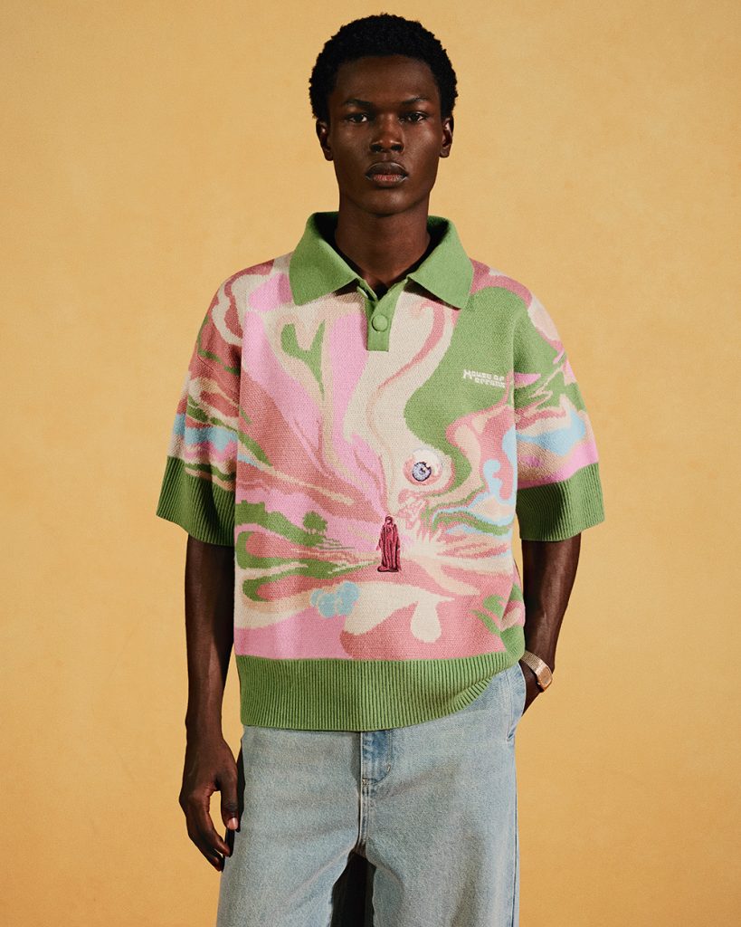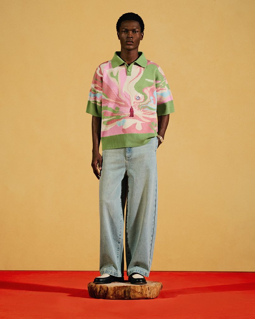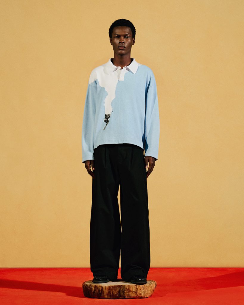 The opening point of TESHIGA is defined by two spiralling knitted polo shirts that set the tone for the entire collection. These pieces introduce a fluid, unrestricted approach to colour, where tonal shifts feel almost organic and uncontained, evoking a dreamlike visual state.