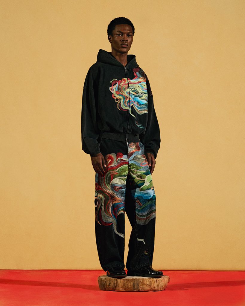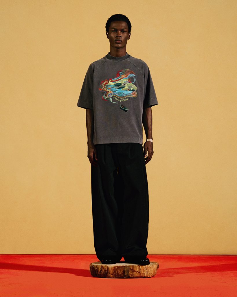 TESHIGA develops its storytelling through a coordinated set of garments like embroidered trousers, hoodies and graphic tees. Across all the pieces, a functional terrain has been depicted, representing a continuous journey that moves from mountain summits down towards their base. This visual progression creates the sense of movement through an imagined world, where each piece captures a different moment,