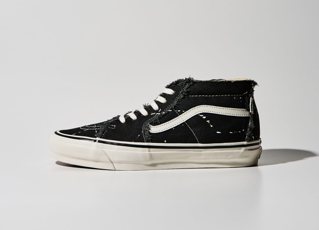 The INVINCIBLE® × Vans SK8-Mid “Off The Rhyme” elevates mid-top skate style with a focus on rhythm and progression. Crafted with double-layer construction, the silhouette reflects the abrasion and wear of skate life, revealing Vans’ iconic checkerboard underlay over time. Left and right shoes carry unique splatter patterns, creating a mirrored yet non-identical aesthetic inspired by jazz’s fluidity and improvisation. The reimagined Jazz Stripe flows across the upper, emphasizing movement and the evolution of skate-worn shoes. Designed exclusively for INVINCIBLE® stores, the SK8-Mid merges heritage Vans elements with inventive design, making it a standout for collectors and skaters alike.
