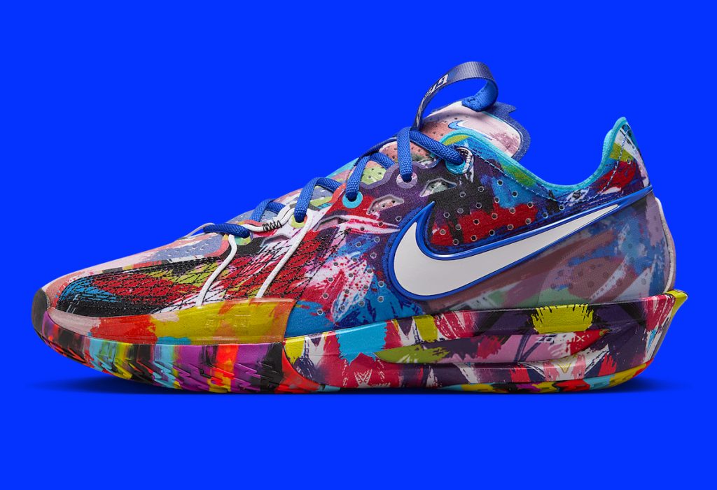 Nike continues to shine a spotlight on elite female athletes with Jewell Loyd’s second Nike Zoom GT Cut 3 PE—a sneaker that mirrors her dynamic playing style and fearless energy. This Player Exclusive (PE) brings an artistic edge to performance footwear with vibrant splatter paint effects across a mix of textile and suede panels. The sneaker’s bold multi-colored upper is balanced by muted tones on the tongue and toe box, allowing the bright accents to stand out. A clean white Swoosh, outlined in blue, pairs with matching lace details, while an icy blue sockliner adds a fresh touch.