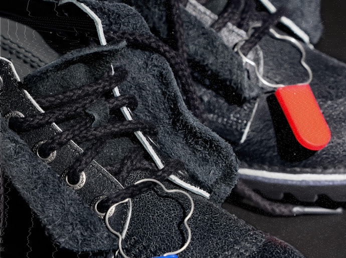 Onyx, meanwhile, delivers a darker, more monolithic interpretation. Black leather and suede create depth and shadow, amplifying the silhouette’s architectural quality. In this colourway, the coloured fleurette and outsole plug stand out with graphic clarity, cutting through the tonal upper.