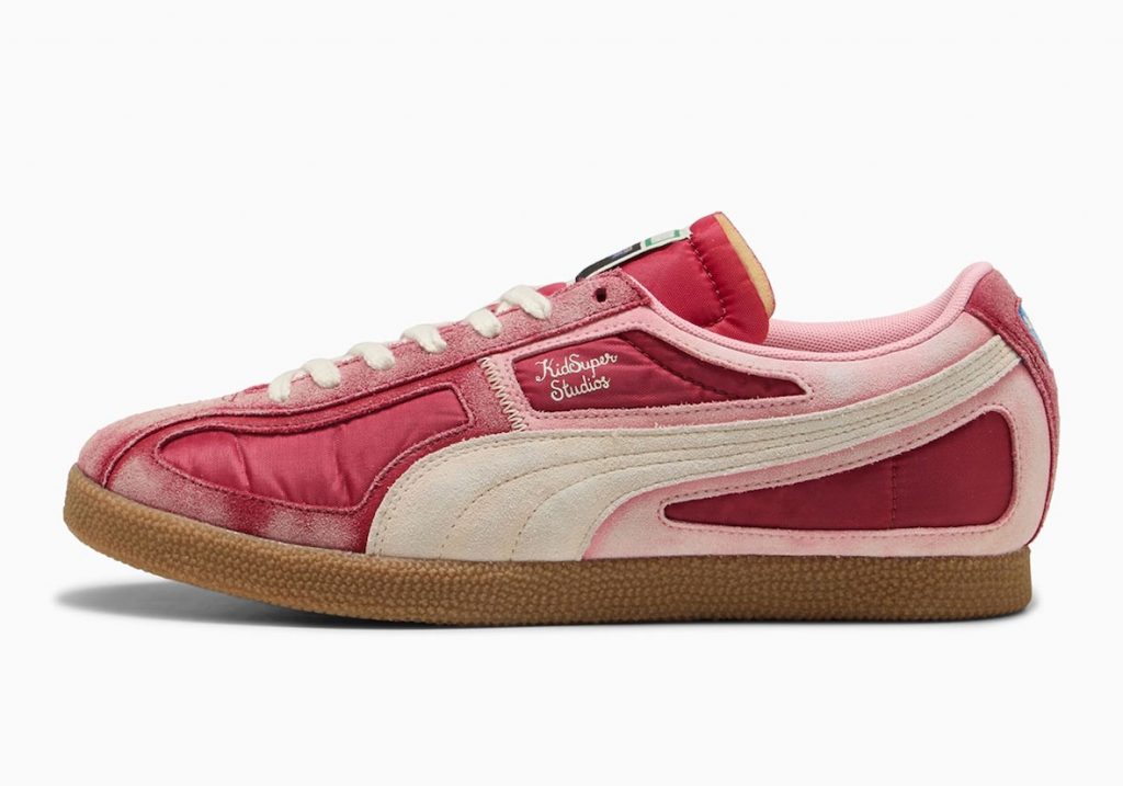The KidSuper x PUMA Brasil Panels Red sneaker reinvents the iconic silhouette with a vibrant, artistic edge. Dusty red suede overlays feature custom cutout “windows” revealing the nylon base underneath, while midfoot stitching divides the upper into contrasting light and dark halves. Exposed foam tongues and co-branded tags enhance the deconstructed aesthetic. Sitting on PUMA Brasil’s signature gum sole, this playful yet detail-driven design launches August 30th on PUMA.com and at select retailers.