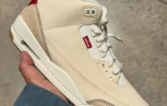 The upper is built from Sail-toned denim, the kind that looks soft enough to wear in but structured enough to hold shape, giving the Jordan 3 a workwear edge without tipping into costume territory. Levi’s puts its stamp on the lateral side with a red tab, tiny, classic, unmistakable. Fire Red heel tabs punch through the palette with sharp contrast, instantly anchoring the shoe within the AJ3 lineage.