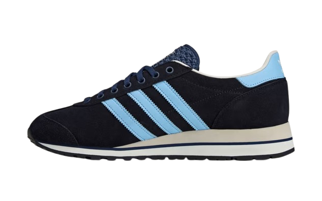 The sneaker sports a deep navy suede upper with tonal leather overlays, contrasted by crisp white Three Stripes and heel tab detailing. A subtle pop of gold appears in the SPZL tongue branding, adding a refined touch that mirrors Liam’s flair.