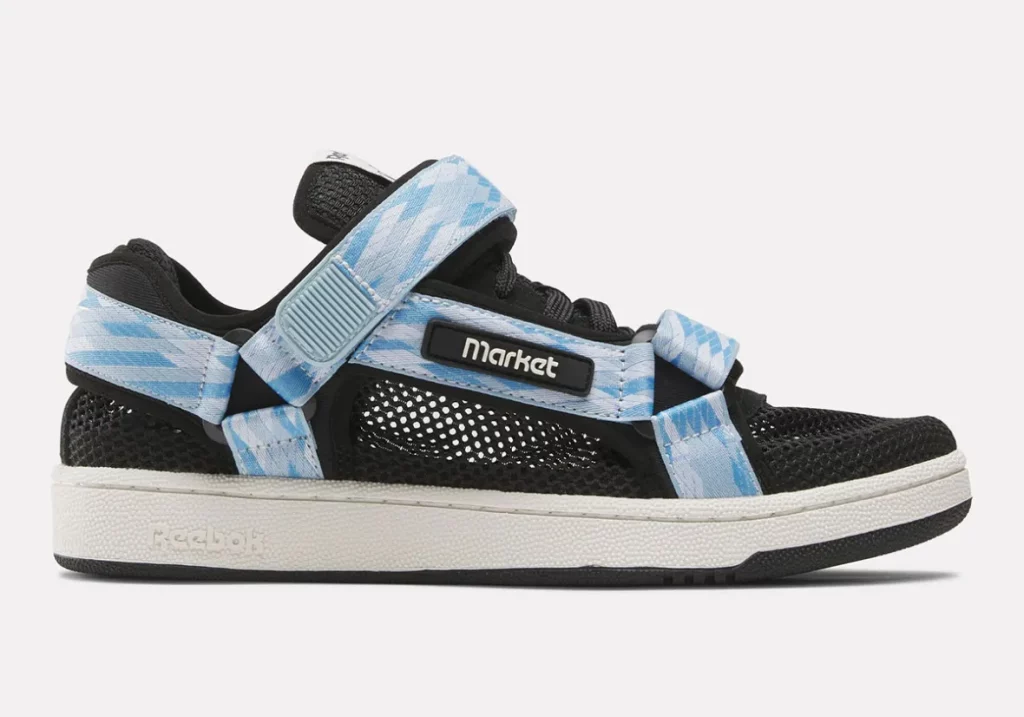 The texture provides comfort and a playful nod to seaside culture. Over the top, argyle-patterned straps cross the midfoot, a detail that feels unusual for the Club C yet distinctly Market in its humour and nonconformity. This addition pushes the design firmly into lifestyle territory, straddling the line between sneaker and leisurewear.