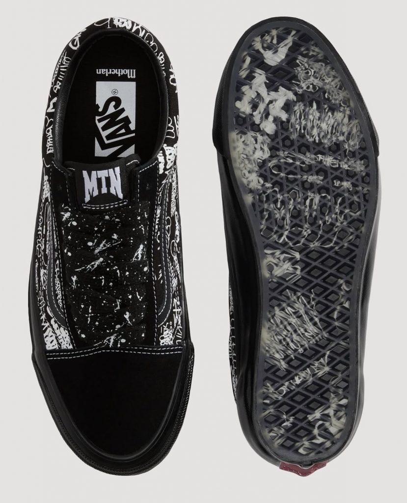 The black suede and canvas base keeps it grounded, a stable backdrop that lets the white scrawl take centre stage without the shoe tipping into overloaded. The midsole stays classic white, giving contrast to the upper’s intensity and making the Vans waffle sole pop visually. Inside, the insole branding toggles between Vans and Motherlan, signalling a true partnership rather than a superficial “print-and-drop.”