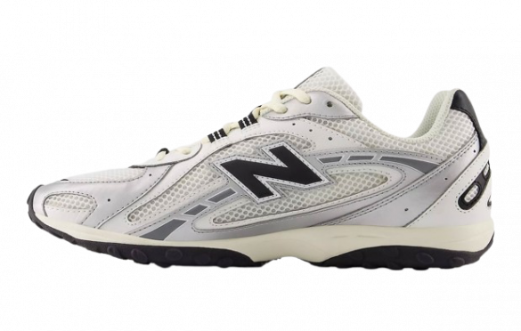 The upper combines a jet-black mesh base with shimmering silver synthetic overlays that recall the metallic track shoes New Balance became known for in the early 2000s. Each panel has been layered for dimensional depth, giving the silhouette a sculpted, performance-driven form.