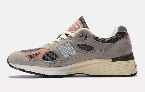 Grey suede overlays form the backbone of the upper, layered over dark mesh to create depth and structure. Salmon accents sweep across the midfoot and tongue, introducing warmth without disrupting the neutral flow. Compared to more expressive recent 991v2 releases, this execution feels deliberately restrained.