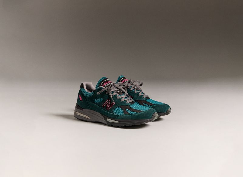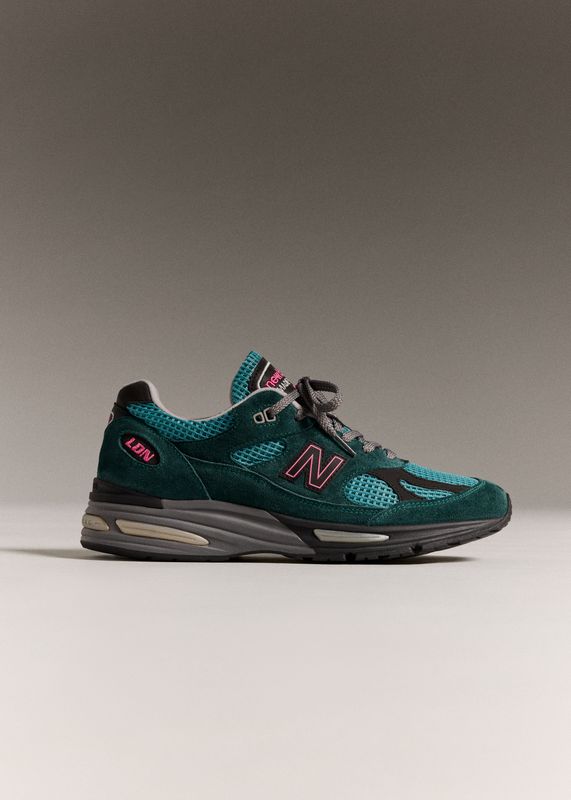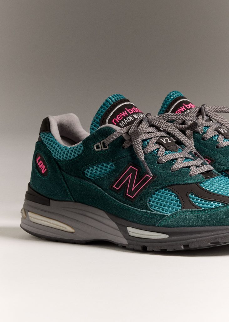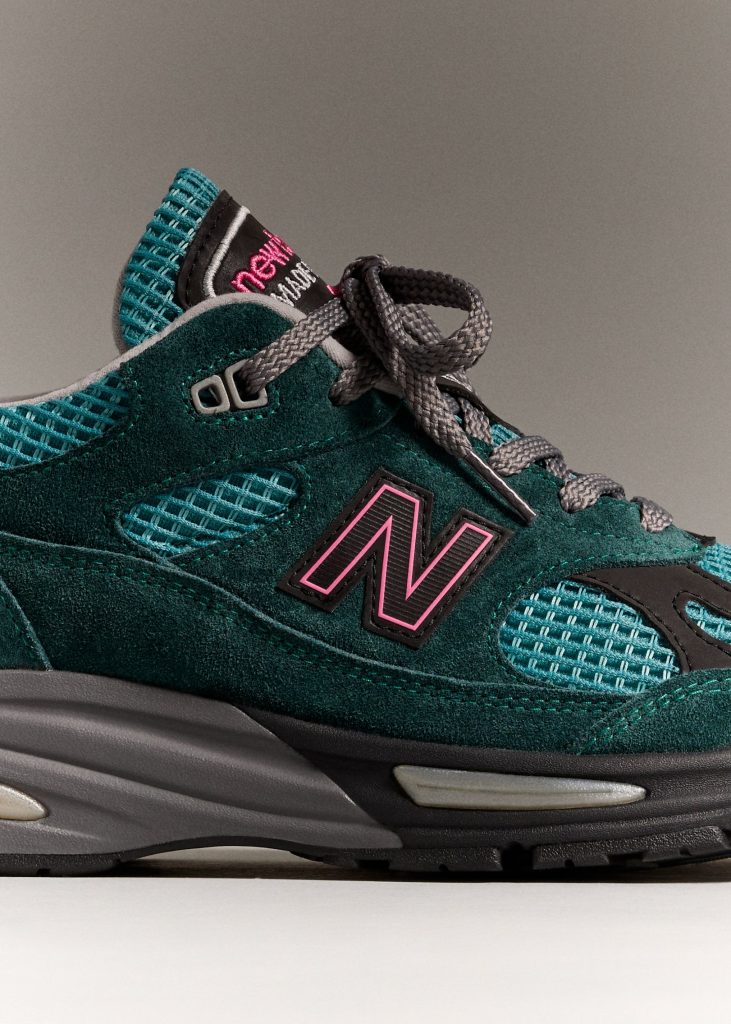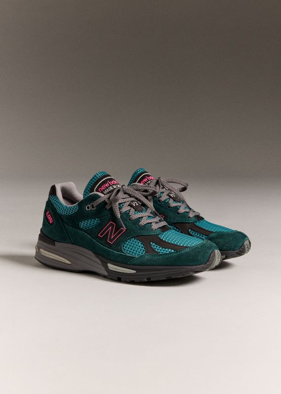 Built at the brand’s Flimby factory in Cumbria, the 991v2 carries the finishes expected from the Made in UK line. The upper combines premium suede in dark sea and tonal tones with a breathable waffle-mesh base, creating a perfect balance. The palette draws from New Balance’s performance range, giving the sneaker a slightly sport-driven feel.