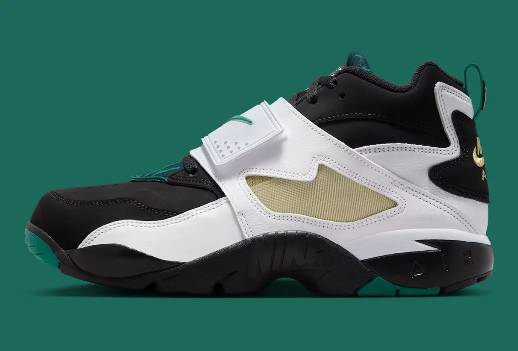 Deion Sanders’ legendary first signature sneaker, the Nike Air Diamond Turf, makes a grand comeback in the iconic “Emerald” colorway for Fall 2025. Originally launched in 1994 and revered for its dual-sport legacy, this marks the fourth reissue of the classic silhouette, with Nike staying faithful to the original’s design and build. The “Emerald” edition blends timeless shades of Black, Mystic Green, White, and Golden Tussah. Premium white leather wraps the lower panels and mid-foot strap, offering durability and that vintage appeal. The upper features contrasting black nubuck, delivering a sleek, bold statement on the field or street.