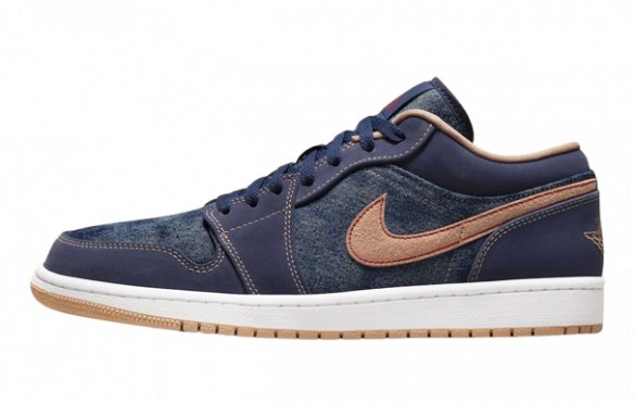 Washed blue denim dominates the upper, paired with deep navy leather overlays that provide structure and contrast. Tan suede swooshes and collar linings add warmth and texture, while the gum sole below brings an earthy balance to the cooler tones above. Red Jumpman logos on the tongue and heel inject that classic Jordan pop of energy. A white midsole completes the design, grounding the pair in heritage while keeping it effortlessly wearable.