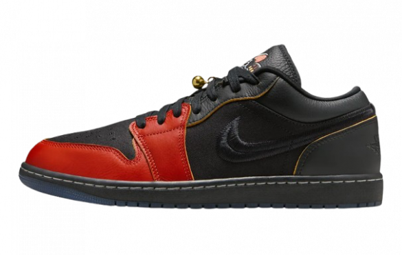 The colour palette is restrained but purposeful. Dragon Red leather energises the forefoot, while black panels dominate the rest of the upper, anchoring the design and keeping it grounded. Yellow piping traces key edges, adding contrast while subtly referencing traditional ornamental finishes. The materials feel elevated, with textures that are more refined than typical seasonal AJ1 Lows.