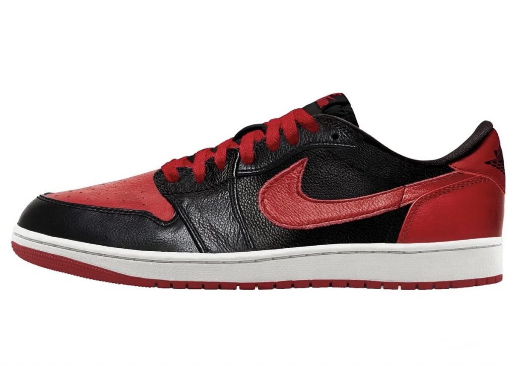 That mark, of course, nods to the original 2011 Air Jordan 1 High “Banned”, a pair never granted a full retail release but adored by collectors for its rebellious backstory. This low-top brings the myth back to life through a truer-to-OG lens: premium tumbled leather underpins the black base, red overlays wrap the toe and heel, and tonal red laces and outsole add punch. Balancing the look, a white midsole slices through the drama, ensuring wearability beyond nostalgia.