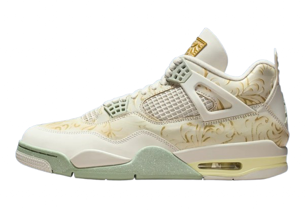 The upper features Soft Pearl, Metallic Gold, Light Bone, and Jade Horizon, evoking the marigolds and gilded motifs of traditional ofrendas. Smooth leather and breathable mesh maintain the AJ4’s familiar structure, while details like gold tongue patches, chain-accented hangtags, and “Somos Eternos” insoles elevate the concept.