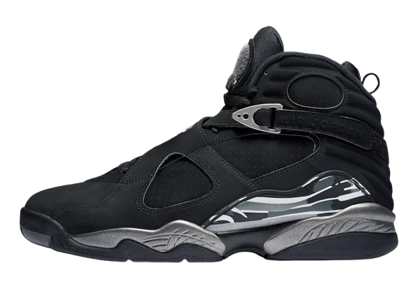 Dressed in premium black nubuck, the upper exudes luxury with its soft texture and polished finish. The chrome accents most notably seen on the buckle hardware and midsole, bring a sharp, futuristic edge to the AJ8’s famously bold construction.