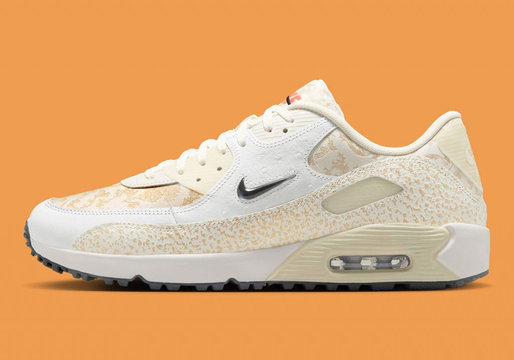 The Air Max 90 Golf “Scottish Open” is adorned with premium materials that echo the luxurious tastes of the monarchy. It features ostrich leather overlays, a patterned silk base, and Sail leather panels embedded with metallic gold flakes for a touch of opulence. But Nike’s signature irreverence comes through with the tongue and insole branding, bright orange “Golf” text is boldly crossed out, referencing the sport’s once-illegal status under royal decree. It’s a satirical yet stylish take on golf heritage, merging Nike’s design flair with a playful historical reference. Whether you’re on the course or off it, the Air Max 90 Golf “Scottish Open” brings a sense of legacy, luxury, and layered storytelling to every step