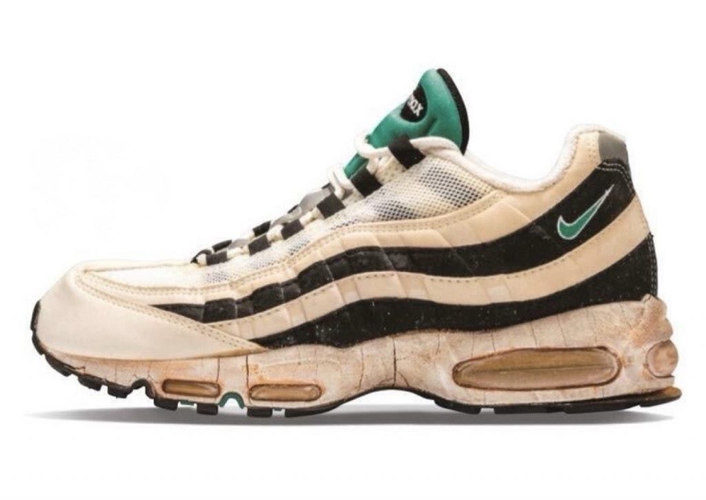 The upper combines premium mesh and smooth leather, reinforcing the Air Max 95’s signature layered look. A small emerald swoosh on the lateral side and vibrant green visible air cushioning units complete the striking style.