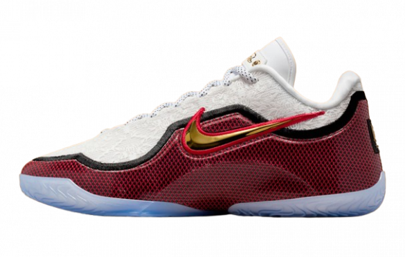 The upper combines white woven textiles with a red knit containment layer, both chosen for their tactility and structure. Gold embroidery runs through the Swoosh, tongue eyelets and LJ23 heel logo, glinting like medals against the minimal palette. Inside the collar, stitched in quiet handwriting, the date “10-29-2003” reminds wearers of the exact moment LeBron stepped into NBA history.