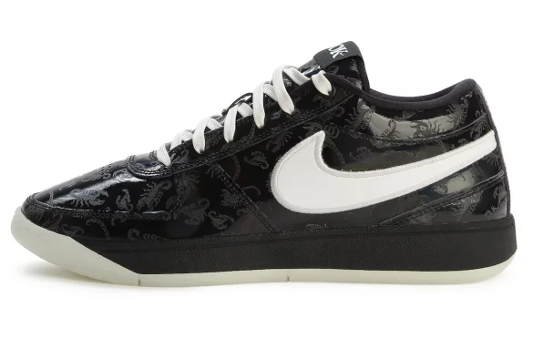 The upper is crafted in sleek black patent leather with embedded scorpion graphics that reveal an iridescent shimmer under light, a subtle nod to transformation and hidden intensity. When viewed from different angles, the scorpions almost appear alive, lending the sneaker an eerie sophistication.