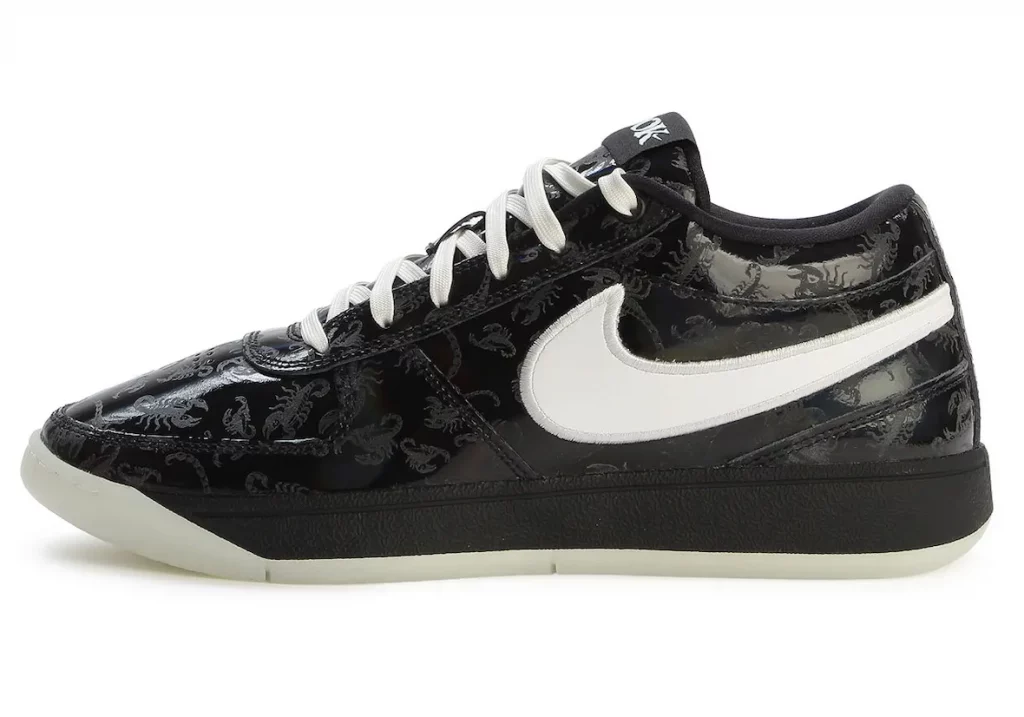 The upper is crafted in sleek black patent leather with embedded scorpion graphics that reveal an iridescent shimmer under light, a subtle nod to transformation and hidden intensity. When viewed from different angles, the scorpions almost appear alive, lending the sneaker an eerie sophistication.