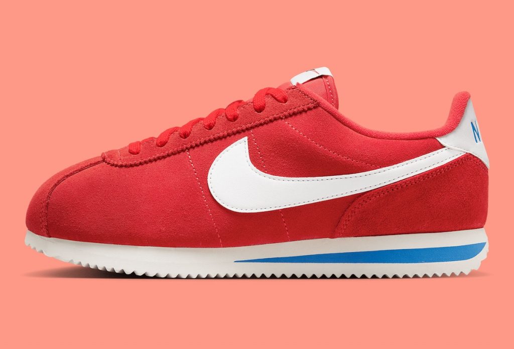 Turn up the heat this summer with the Nike Cortez “Light Crimson”, a women’s exclusive that fuses retro roots with fearless flair. Swapping out its usual leather shell, this version scorches the streets in vibrant crimson suede, bringing high-impact color to a timeless silhouette. A clean white Swoosh slices through the red with sharp contrast, while blue accents on the midsole nod to the original 1972 Cortez colourway, giving this fiery remix a touch of classic cool. The herringbone outsole keeps things functional, delivering grip and durability with every step. Lightweight, low-cut, and built for effortless everyday style, the “Light Crimson” Cortez is perfect for summer strolls, throwback fits, or adding that pop of colour your rotation’s been missing. This isn’t just a sneaker, it’s a statement.