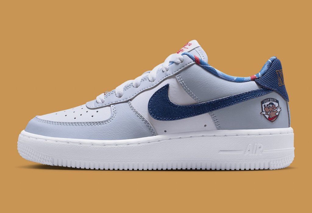 The Nike GS Air Force 1 Low “Just Do It” takes a streetwear classic and flips it into a youth-exclusive statement piece for Summer 2025. Dropping in White/Ghost/Midnight Navy, this AF1 stands out with unexpected textures and playful personality. Instead of standard leather, Nike goes bold with textile overlays, adding dimension and a more relaxed vibe. A plaid blue-and-red lining spices things up on the inside, while a shiny gold lace dubrae gives the toe box a pop of bling. Varsity-inspired heel embroidery and custom logos on the tongue and heel reinforce the remix energy.