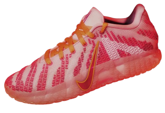 The upper uses a woven textile base that fades between soft pastel pinks and saturated magentas, creating depth and movement even when still. Bright orange laces add a touch of chaos, while the gradient magenta-to-yellow Swoosh gives the illusion of speed, like motion blur on a fast break.