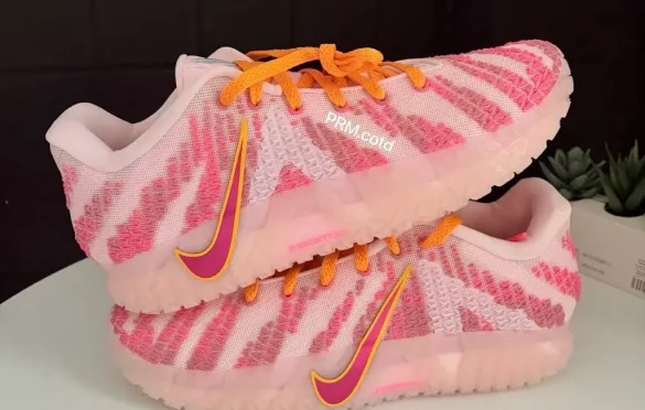 The upper combines soft pinks and rich reds, creating a pattern that’s festive without being overdone. Bright orange laces add contrast, while a champagne-toned midsole gives the shoe a polished, celebratory finish. An orange Swoosh runs along the side.