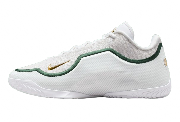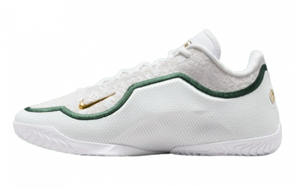 The colourway mirrors the legacy. White, Stadium Green, Light Smoke Grey, and Black pull from the palette of St. Vincent–St. Mary, the high school that turned LeBron from a local phenomenon into a national headline.