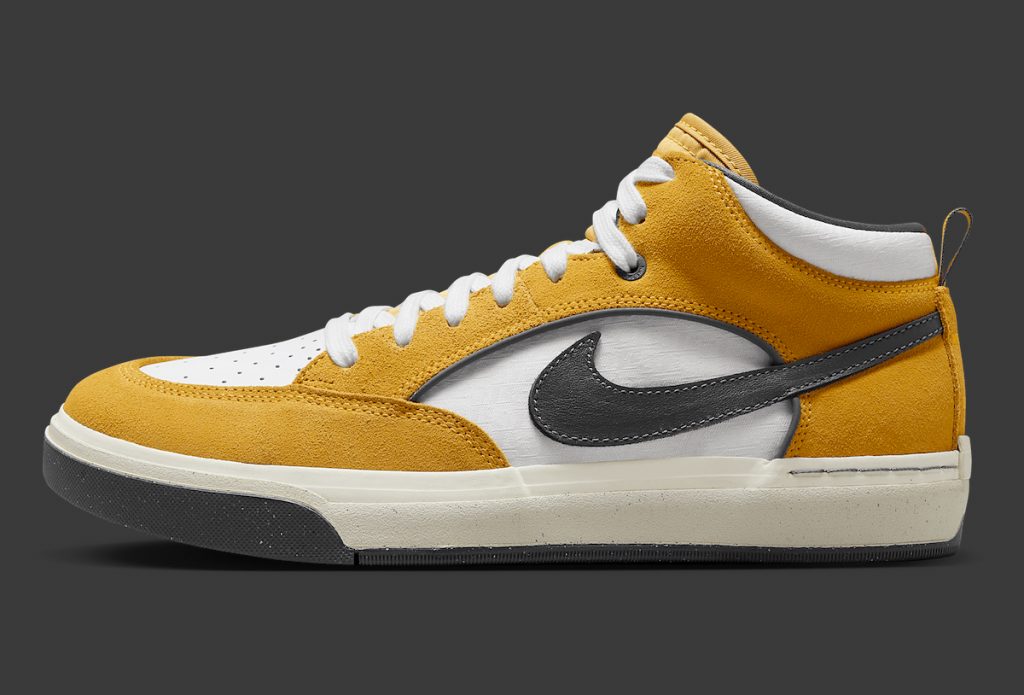 Leo Baker’s signature skate shoe with Nike SB continues to evolve, delivering both style and high-performance functionality. Since its 2023 debut, the SB React Leo has earned respect in the skateboarding community, and now, for Summer 2025, it returns in a bold “University Gold” colourway. This release features soft, durable suede overlays in rich golden yellow tones, providing a striking yet wearable look. A dark grey Swoosh and outsole contrast sharply with the upper, adding depth and balance. Satin-textured details on the collar and side panels introduce a touch of subtle refinement, while a white perforated leather toe box enhances breathability for long skate sessions.