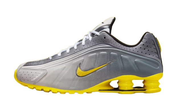 But while the base stays neutral, bright yellow accents shake up the calm hitting the Swooshes, branding elements, and most dramatically, the unmistakable Shox columns underfoot.