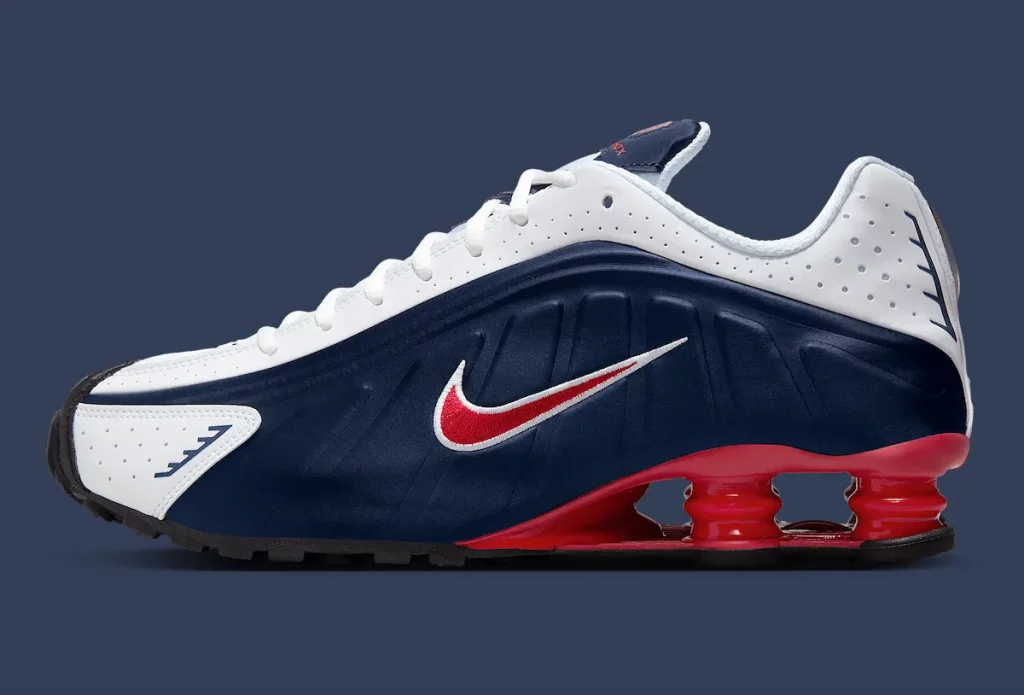 Back with a bang for Independence Day 2025, the Nike Shox R4 “USA” makes a bold return, channeling early 2000s energy, patriotic pride, and Olympic-inspired flair. First released in 2020 and subtly linked to Vince Carter’s dominant Team USA performance, this reissue lands just in time to turn heads at cookouts, parties, and fireworks shows alike. The upper features a crisp white synthetic base with deep navy overlays that hug the sides in aerodynamic fashion. Bright red Shox columns under the heel provide signature bounce and visual punch, while matching red accents hit the Swoosh, outlined in white for extra pop. And in a subtle update for 2025, Nike introduces a black outsole with red circular grip zones, blending style with enhanced traction. Whether you’re chasing summer nostalgia, basketball legacy, or just love a red-white-and-blue moment, the Shox R4 “USA” delivers bold looks and bouncy comfort in one patriotic package. Fireworks not included, but the flex is guaranteed.