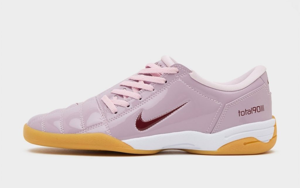 Nike is serving up glossy nostalgia with a twist in the Total 90 III “Pink Gum.” Originally a football pitch icon, this cult classic gets a streetwear makeover, swapping cleats for lifestyle swagger and tapping into the current wave of Y2K revival. The upper arrives in a glossy pastel pink finish that looks straight-up dipped in strawberry milk, soft, bold, and unapologetically fun. Burgundy details accent the mini Swoosh, tongue, heel tab, and the oversized “90” heel branding, offering a rich contrast that plays perfectly against the pink base. Matching pink laces seal the look, adding to the candy-coated aesthetic.