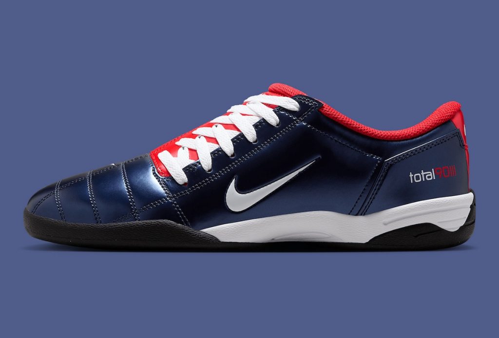 Nike brings back a cult classic with patriotic flair in the Total 90 III “USA”, set to heat up Summer 2025. Designed for indoor dominance and nostalgic swagger, this silhouette blends retro football vibes with bold national energy. The glossy navy upper nods to vintage team kits, accented by fiery red collars and medial panels. Crisp white Swooshes, laces, and midsole trim balance the bold with the clean. And of course, that oversized “90” logo on the heel brings unmistakable throwback heat. Down below, a black gum outsole ensures grip on every quick turn and slick pass, making this a perfect blend of style and performance, whether you’re playing five-a-side or just flexing your football heritage.
