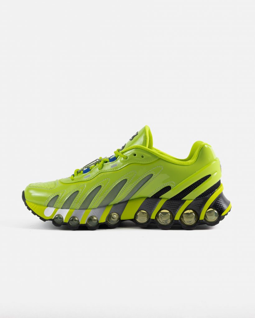 The Patta x Nike Air Max DN8 “Volt” arrives as the boldest colourway in the collaborative line, putting the spotlight firmly on Nike’s experimental cushioning technology. Its upper is dressed in a striking neon “Volt” finish across glossy overlays, making the shoe instantly recognisable from any angle. Beneath the shine, subtle mesh underlays allow the structure to breathe while grounding the design just enough to keep it balanced.
