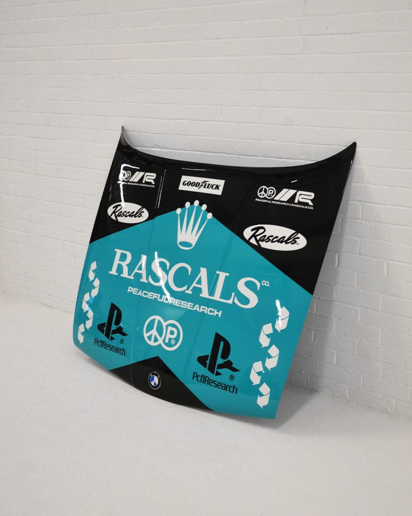 Among the headline pieces is PR002C, a fully working clock constructed from an original Ferrari 400GT speedometer. This piece leans into the original identity of the car, preserving the raw mechanical characteristics. Elsewhere, the PR002G introduces silk-screen printed driving gloves, whule PR002B sees a BMW E30 bonnet reimagined through layered racing decals.